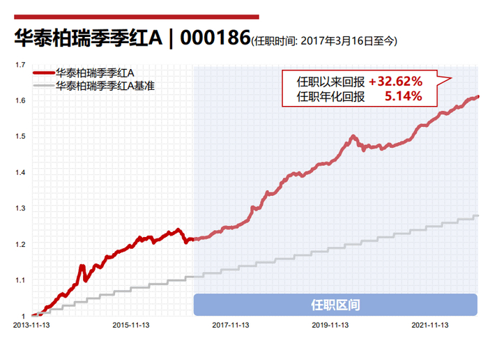以其代表作华泰柏瑞季季红债券基金A为例,自其2017年3月开始管理以来,每一个完整年度(2018-2021)都实现了正收益,近五年回报位居晨星开放式信用债基金的前8%(10/140)。