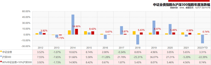 他做过一项统计,若以中证全债代表债券资产,沪深300代表权益资产,从2012年以来,债券资产有两年收益为负,权益资产有五年收益为负,但是股债双跌的年份只有2013年一年。也只有在这一年,90%中证全债+10%沪深300的“一九”组合是负收益,其余年份都取得了正收益(指数历史回报不代表未来表现,不构成对基金业绩表现的保证,请投资者关注指数波动风险)。