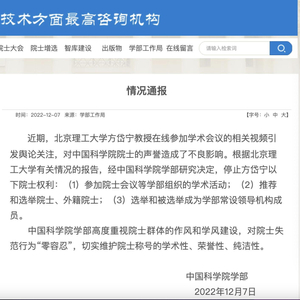 中国科学院学部通报表示,高度重视院士群体的作风和学风建设,对院士失范行为“零容忍”,切实维护院士称号的学术性、荣誉性、纯洁性。
