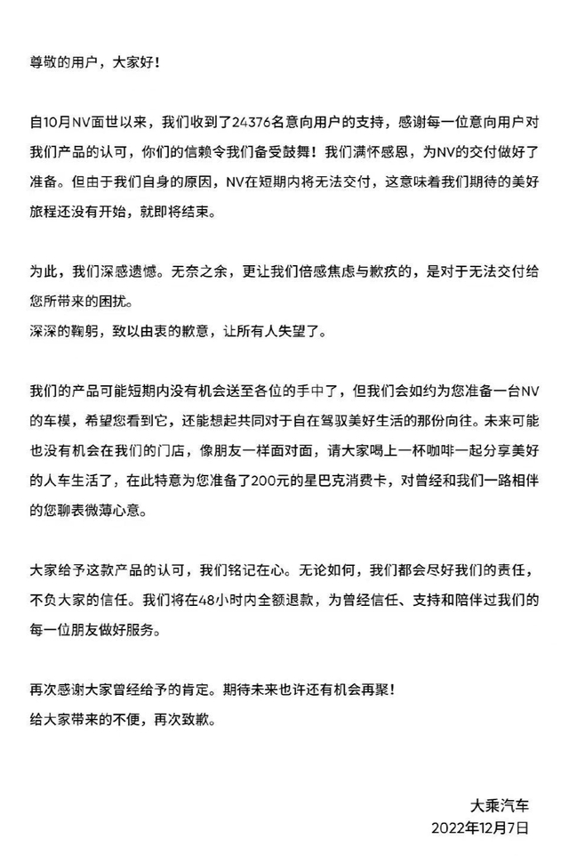 12月7日一早,自游家(牛创旗下品牌名)官方发布了一封给用户的致歉信,称首款车型NV在短期内无法交付,将会在48小时内全额退款。自游家将会如约为用户提供一台NV的车模,还将为用户准备200元的星巴克消费卡。致歉信的落款为“大乘汽车”。