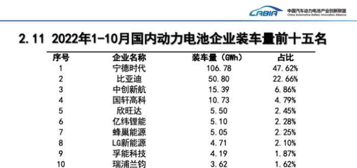 中国汽车动力电池产业创新联盟数据显示,今年前10个月,国内动力电池装车量前十企业中,宁德时代、比亚迪稳坐冠亚军,市占率合计70.28%。