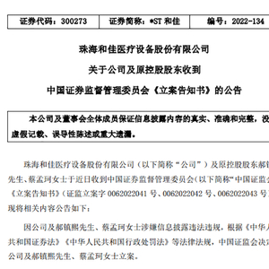 12月7日晚,*ST和佳发布公告称,公司及原控股股东郝镇熙、蔡孟珂于近日收到中国证监会《立案告知书》,因公司及郝镇熙、蔡孟珂涉嫌信息披露违法违规,根据《中华人民共和国证券法》《中华人民共和国行政处罚法》等法律法规,中国证监会决定对公司及郝镇熙、蔡孟珂立案。
