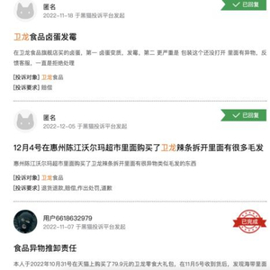截至今年12月7日,在黑猫投诉上,消费者对卫龙的投诉量达到841条,投诉内容多以产品质量问题为主,近一个月内的投诉包括“卤蛋发霉”、“食品异物推卸责任”、“吃到塑料”、“吃到头发”等,涉及产品包括溏心卤蛋、魔芋爽、辣条等。