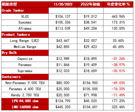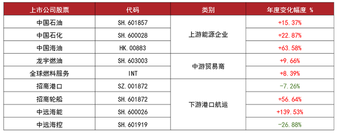 股票走势往往能直观地反映各行业发展状况,2022年(截至12月5日数据)上证指数年线收跌11.76%,在宏观金融市场表现不佳的情况下,传统能源板块、能源运输板块及燃料油中游贸易商板块均走出周期性强势行情。以原油、天然气为主的能源商品受俄乌冲突带来的供给端压力影响呈现出波澜壮阔的行情;燃料油中游贸易商经营利润也水涨船高,尤其是低硫燃料油船供市场,出现了2019年末高低硫转换机遇以来的最强周期行情,船供贴水于5月再度冲上Mops+100美元/吨的水平;下游航运端则出现极大分化,集装箱运输市场高位回调,集装箱运费从2022年年初一直跌到年尾;能源运输市场则受运距拉长和有效运力紧张影响,不管是LNG运输或是成品油/原油运输,则出现周期性暴涨;散货运输则持续震荡,但总体来说仍略强于2021年。