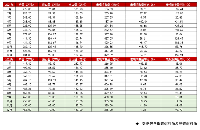 高硫需求端:2022年集装箱、干散货等主要板块的运价指数已经从高位显著回落,相应船舶的航行速度也明显下滑。不过与之相对,油运板块由于对俄制裁等因素呈现出走强的态势,但考虑到油运板块占据船燃消费的比例低于集装箱和干散货,预计难以完全对冲,在这样的趋势下,明年航运端需求支撑因素减弱;四季度,中国开始于新加坡市场积极采购相对廉价高硫燃料油,对高硫深加工额外需求形成支撑,预计2023年,高硫需求端将维持稳定。