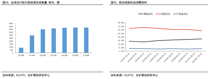 在航运业整体景气度回落的背景下,作为最主流燃料的低硫燃料油需求或缺乏足够的驱动(船燃也是低硫燃料油最主要的消费下游,占比超过90%)。但与此同时,高硫燃料油由于其价格优势,在航运等终端需求存在额外的增量预期。具体来看,虽然相比最高位置已显著回落,但高低硫燃油现货价差目前仍可以达到200美元/吨,这意味着脱硫塔的投资与安装依然是具备经济性的。实际上,在今年的高低硫价差水平刺激下,全球脱硫塔订单及安装进度确实出现了边际加速的迹象。相应地,船用高低硫消费比例的切换节奏也受到提振。往前看,我们预计这一趋势有望在明年延续,但高低硫价差回落后节奏会有所放缓。而且,由于脱硫塔订单+安装周期较长,对于实际需求的影响是渐进式的。不过从边际变化的角度来看,预计脱硫塔存量的扩充将延续高低硫消费的替换趋势,给高硫燃料油需求带来额外增量。