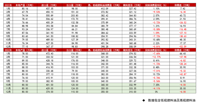 高硫供应端:受欧美对俄制裁影响,2022年俄罗斯燃料油总产量、出口量下降背景下,出口至亚太燃料油屡创新高,俄罗斯被迫在制裁前将大部分燃料油出口转移至高硫燃油主要需求地——亚太。虽然2022年3-4月,新加坡高硫燃料油受到污染因素影响,供给端出现紧张情况,但未能影响整体大局。全年来看,今年亚洲区内高硫燃料油始终处于富余状态。