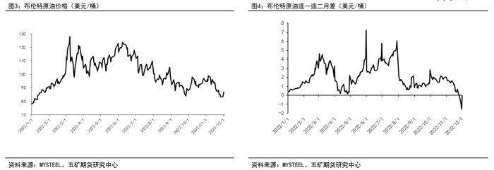 2022年的油市呈现因地缘政治紧张急速走高后震荡下行的走势,市场运行的逻辑从俄乌冲突带来的供给端紧张,转移到紧缩性的宏观金融政策带来的需求下行预期中来。随着宏观金融政策的收紧,大量宏观配置资金退出,市场流动性持续下降,油价出现量价双跌的局面。截至2022年12月5日,油价仍处于多空持续博弈的状态,利多点主要还是来自供应端:1.原油禁令 12 月 5 日生效,成品油禁令 2 月 5 日生效),欧盟禁运落地后,俄罗斯石油销售将面临巨大挑战,其供应或将继续下滑;2.在油价显著回撤后,OPEC存在减产以稳定油价的倾向;3.美国SPR战略库存已经处于1986以来的低位水平,存在极大的补库潜力,对油价存在明显支撑。利空点主要来自于需求端:美联储加息进程在2023年将会持续,全球经济将不可避免地承压,石油消费需求将受到挑战,2022年11月以来布伦特原油的近端月差迅速下跌也反映出市场对需求的极大担忧。参考三大机构的平衡表,EIA对 2023 年需求增长预估为 116 万桶/日;OPEC 预计 2023 年需求增长为 225 万桶/日;IEA 预计 2023 年全球需求增长为 161万桶/日,明年的需求仍存在一定的增长预期,但增长幅度将显著低于2022年。总体来看,2023年国际原油市场将出现供需两弱格局,国际油价大幅上涨和下跌的空间都有限。