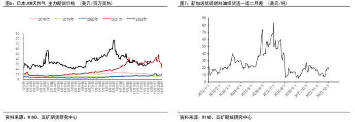2022年天然气市场受到俄乌冲突影响同样出现波澜壮阔的行情,日本、欧洲天然气价格均创下历史极值。低硫燃料油含硫量为0.5%,符合发达国家发电排放要求,在天然气持续大涨的过程中,油气替代成为热门话题,低硫燃料油同时叠加成本较低优势,成为液化天然气发电需求的替代品。日本JKM天然气走势与新加坡低硫燃料油月差变化情况高度相关,在2022年5-7月,低硫燃料油近端强势的月差暗示了其旺盛的需求,随着欧美补库紧张顺利,天然气价格出现明显回落,低硫燃料油替代需求不断回落,叠加暖冬预期影响,2022年年末至2023年年初,低硫燃料油发电需求预期将持续走弱。