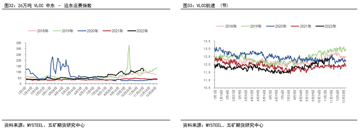 在2021年下半年到今年上半年的一年多时间里,由于供应链的错配,以集装箱板块为代表的航运市场经历了极高的市场景气度,运价一度达到历史高位。高运价一方面反映了航运活动的旺盛,另一方面也刺激船东或租船人大幅提升船舶的运输速度,这将促进燃料的消耗效率,从而支撑船用燃料油需求。但随着供应链错配矛盾的缓解、以及全球经济环境的边际恶化,集装箱、干散货等主要板块的运价指数已经从高位显著回落,相应船舶的航行速度也明显下滑。不过与之相对,油运板块由于对俄制裁等因素呈现出走强的态势,但考虑到油运板块占据船燃消费的比例低于集装箱和干散货,预计难以完全对冲。在这样的趋势下,明年航运端需求支撑因素减弱。当然,在国际油价从最高位回落后,船东与租船人的燃料成本压力得到一定程度缓和,但整体而言明年船燃需求可能缺乏明显的上行驱动。如果全球经济衰退形势加剧,航运端燃料油需求甚至面临一定的压力,燃料油整体需求蛋糕在变小。