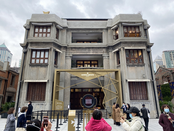 另外几栋老建筑也已改造成品牌店铺。威海路588弄31号是一栋精美的三层近代花园里弄住宅,曾为李鸿章侄孙李荫轩所有,现为LV门店,需预约参观,门前院子内布置了园林式的景观。一些未预约的市民站在门口拍摄。