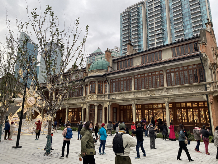 这栋洋房目前是奢侈品牌迪奥的门店,市民在门口排起长队期待入内。门前广场正中安放了迪奥星型装置,十分“吸睛”,西面建筑的墙上悬挂有“张园OUR PRIDE.OUR PLACE.”的大幅标牌,也吸引了众多市民打卡拍照。