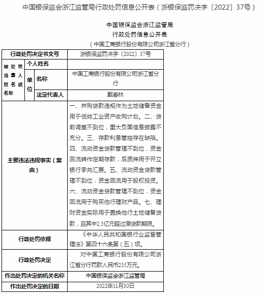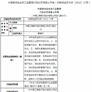 涉理财资金用于置换他行土地储备贷款等多类问题,工商银行浙江省分行被罚款235万元