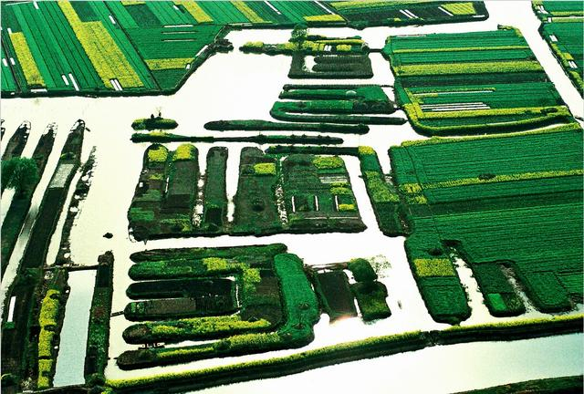显而易见,垛田的形成绕不开兴化人“闻之伤心、听之落泪”的抗洪史。先人们在疏浚河道方便行洪的同时,将河底淤泥堆砌到原先的垛田地基上,为子孙后代留下可堪耕种的珍贵土壤。垛田在毁灭中不断重生,最终形成了高达4-5米的水上高田。四面环水的地形则是为了便于浇灌,并由此衍生出“劚岸、戽水、罱泥、扒渣、搌水草”这类垛田人才能全套掌握的生产技艺。过去的垛子戽水时要来个接力赛,先在坡面上由低到高挖上三四个坑塘,或放上三四只木桶,顶部平面再顺着挖一条流水槽(灌槽),然后每档一人,手握长柄水瓢,依次上水传水,才能将水浇到垛子顶上。这是国内外唯一、里下河腹地独有的传统农业生态系统。