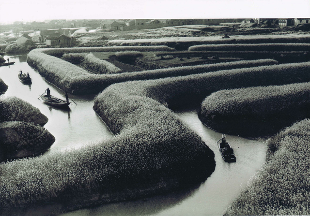 照片中的画面取景于兴化城东南“丁头十八条”,隶属我出生、成长的垛田公社,这里分布着最典型的垛田地貌。所谓“丁头十八条”,说的是一条百十米的长岸打头,旁边丁字形横卧着十八个垛子。在垛田,有很多这种奇形怪状的水上土垛,它们的名字和形状颇令外人“匪夷所思”,桃子垛、琵琶垛、钥匙垛、靴子垛、榔头垛……笔架子、菱米子、酒坛子、秤钩子、龟墩子……这些形象生动的地名“代号”,不仅极尽垛田人天马行空式的想象,也缘于垛田零散破碎而难以统称的岛屿状地形。