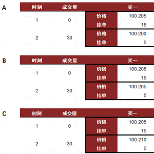 得到初步主动买入估算和初步主动卖出估算后,将它俩按该tick实际订单等比例分配。时刻1至时刻2实际成交30单。在情形A下,初步认定主动卖单估算为15单,初步认定主动买单估算为5单。那么该时刻主动卖单估算为 30 / ( 15 + 5 ) * 15 = 22.5单,主动买单估算为 30 / ( 15 + 5 ) * 5 = 7.5单。在情形B下,初步认定主动卖单估算为10单,初步认定主动买单估算为5单。那么该时刻主动卖单估算为 30 / ( 10 + 5 ) * 10 = 20单,主动买单估算为 30 / ( 10 + 5 ) * 5 = 10单。在情形C下,初步认定主动卖单估算为0单,初步认定主动买单估算为5单。那么该时刻主动卖单估算为 30 / ( 0 + 5 ) * 5 = 0单,主动买单估算为 30 / ( 0 + 5 ) * 5 = 30单。