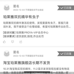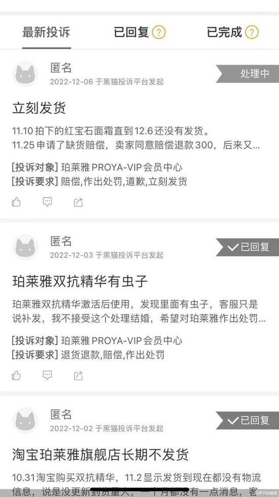 “双11”期间买的产品至今仍未发货,消费者对珀莱雅有了意见。12月6日,消费者王女士向北京商报记者反映,11月10日拍下的珀莱雅红宝石面霜,直到12月还没发货。像王女士这样的情况不少,小姜在黑猫投诉平台这样投诉道:“10月31日在淘宝平台购买的双抗精华,11月2日显示发货,但一直到12月2日没有显示任何物流信息。”