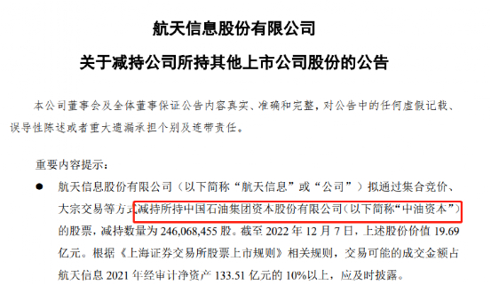12月7日晚,航天信息抛出减持股份计划公告,拟通过集合竞价、大宗交易等方式减持所持中油资本的股票,减持数量为2.46亿股,截至2022年12月7日上述股份价值19.69亿元。