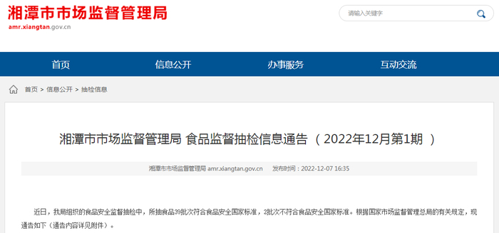 湖南省湘潭市市场监管局抽检食品41批次 2批次不合格
