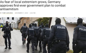 此外,从2020年到2021年,德国反犹太主义犯罪活动显着上升。在搜查行动前几天,面对极端主义威胁的加剧,德国批准了有史以来第一个打击反犹太主义的政府计划,即将采取的战略包括反犹太主义的数据收集、研究和准确评估、预防教育、纪念大屠杀的新方法、增加其安全性、以及让民众了解德国犹太人目前和过去的生活。