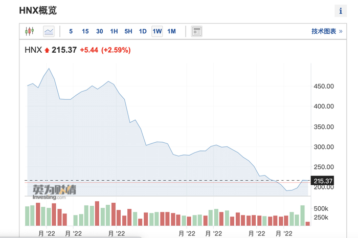 值得一提的是,越南河内指数2021年以203.12点开盘,收于473.99点,全年涨幅为133.35%,涨幅居全球前列;而今年一度抹去去年全部涨幅,12月8日收盘价报215.37点。