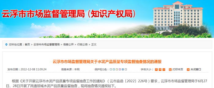 广东省云浮市市场监管局通报水泥产品质量专项监督抽查情况