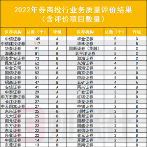值得一提的是,多数仅有1个参评项目的券商,以获B类评级为主,而湘财证券、联储证券、瑞信证券等3家券商只因1个评价项目就获得了C类评价。