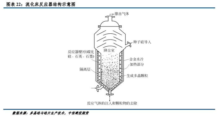 流化床法的基本原理是,原料气体入口在底部,气体从底部进入反应器后上升至加热区,在加热区气体原料分解为固体硅颗粒;从底部不断进入的气体流速会使颗粒硅处于悬浮状态,悬浮的颗粒会不断外延生长,当达到足够重量时,颗粒硅会沉降到底部的容器中;而反应的副产物会从顶部管路排出;最终的多晶硅产物为颗粒硅。