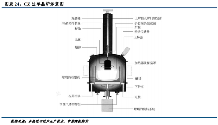 直拉法的原理为,将高纯度多晶硅放置在石英坩埚中加热熔化,再将单晶硅籽晶插入熔体表面,待籽晶于熔体熔合后,慢慢向上提拉籽晶,晶体便会在籽晶下端生长,形成单晶硅棒。