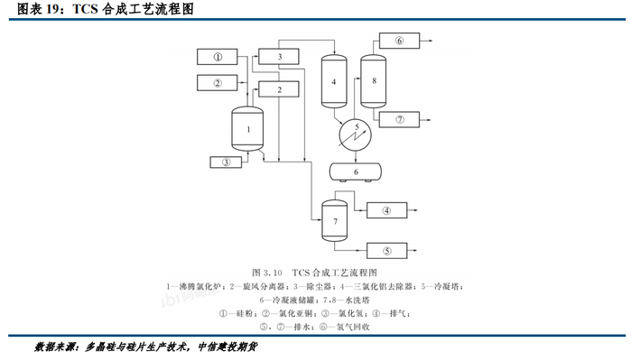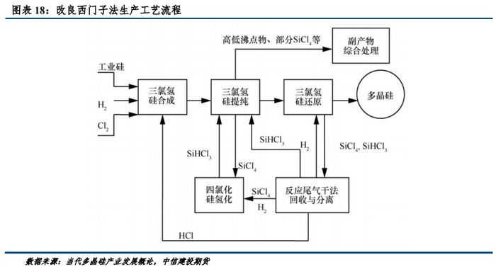 在过去几十年,业界对西门子法不断改进,技术工艺经历了三代演变,目前业界所使用的改良西门子法就是第三代西门子法。改良西门子法的主要流程包括三氯氢硅(简称TCS)的合成、TCS的提纯、TCS的氢还原和反应尾气的回收等步骤。