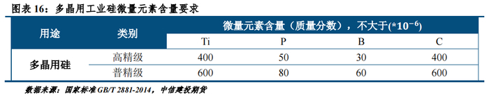 从原料标准看,多晶硅所要求的工业硅牌号以4210#为主,同时搭配5210#、4410#、5530#等牌号混合使用,通常多晶用工业硅中硅的含量在99%左右即可。此外,为了便于反应,工业硅通常被磨成粉状以供多晶硅企业生产使用,即99硅粉。值得一提的是,在现货交易中,除了主成分含量要求以外,多晶硅企业通常还会对工业硅中的微量元素含量有要求,各个企业的要求因工艺特点存在差异,国家标准要求如图表16。