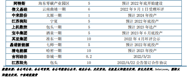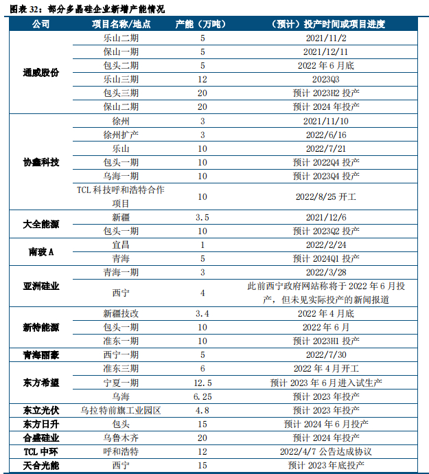 受行业景气度提升、下游需求旺盛、生产利润丰厚影响,2022年多晶硅行业吸引了大量资本青睐,陆续有新建生产项目开工建设。展望未来,2023年新增产能将继续释放,为产业带来更多的供给增量。据百川盈孚数据,2022年10月国内多晶硅产能111.15万吨,如果不考虑产能爬坡、假设新增产能投产时间全部符合预期,那么在111.15万吨的基础上加上协鑫科技包头一期10万吨、江苏润阳宁夏5万吨、晶诺新能源七师一期5万吨产能,则2022年全年多晶硅名义产能或将达到131.15万吨;对于未明确预计投产时间的项目,假设建设周期为15个月,则2023年多晶硅名义产能将有望达到271.7万吨,届时多晶硅的供给端或将迎来大幅增长。
