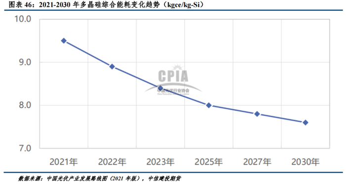 相较而言,多晶硅的综合能耗成本下降较为明显。综合能耗包括多晶硅生产过程中所消耗的天然气、煤炭、电力、蒸汽、水等。据《中国光伏产业发展路线图(2021年版)》数据,2021年多晶硅企业综合能耗平均值为9.5kgce/kg-Si,同比下降17.4%。随着技术进步和能源的综合利用,到2030年预计可降到7.6kgce/kg-Si。