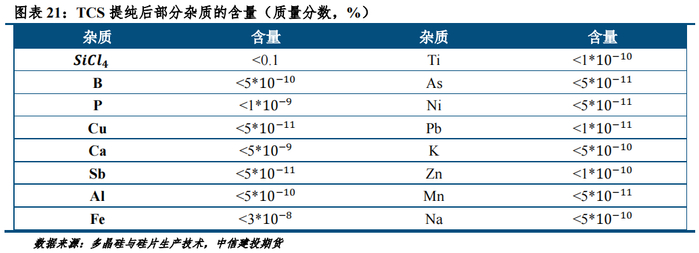 精馏过程是在精馏塔内完成的,会经历冷氢化和合成料提纯、还原回收料提纯、高沸物分离、低沸物分离等过程,精馏之后TCS的纯度可以提高至9N以上。