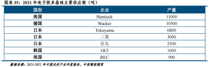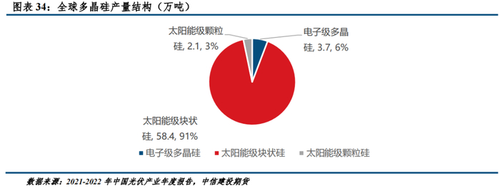 据《2021-2022年中国光伏产业年度报告》,2021年全球电子级多晶硅产量3.7万吨,太阳能级多晶硅(块状硅+颗粒硅)产量60.5万吨。从产量数据可以推断出,目前多晶硅的终端市场还是集中在光伏领域。
