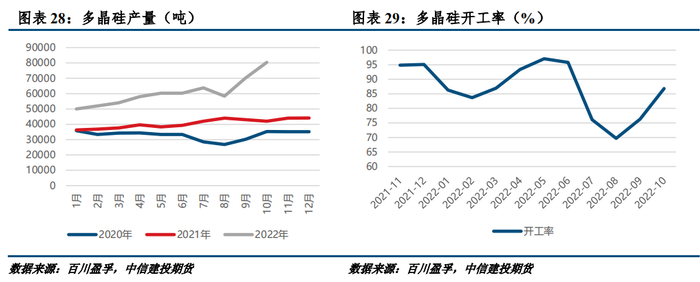 产量方面,根据百川盈孚数据,2020年-2021年我国多晶硅产量相对稳定,随着新增产能陆续释放,2022年产量开始快速增长。2022年10月,我国多晶硅产量8.04万吨,相较去年同期增长91.43%。从开工率来看,2022年Q3多晶硅开工率出现明显下滑,一方面是受某企业出现安全事故影响,多家硅料厂开展检修自查所致,另一方面,部分新增产能投产,产能爬坡过程拖累整体产能利用率的提升。