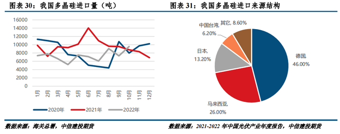 从进口数据看,2021年我国进口多晶硅11.42万吨,相较2020年略有增加,但总体变动相对稳定。分国家和地区看,据《2021-2022年中国光伏产业年度报告》,德国、马来西亚、日本是我国前三大多晶硅进口国,来自这三个国家的进口量达到了9.3万吨。展望未来,随着多晶硅产能不断释放,自给能力不断提升,未来多晶硅的进口依赖程度或将逐步降低。