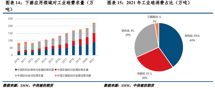 从多晶硅对上游的需求来看,2021年国内多晶硅对工业硅的需求量为62.3万吨,2010年-2021年复合增长率达到了17.99%,增长速度超过了同期有机硅对工业硅的需求增速。随着未来光伏产业不断发展,多晶硅也将实现快速放量,届时下游对工业硅的消费增量或将更多地由多晶硅贡献。