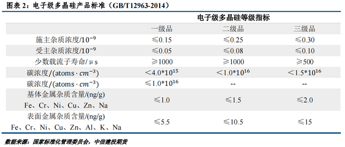 电子级多晶硅(EGS,Electronic Grade Silicon)一般是指纯度在9N以上的多晶硅产品,主要应用于半导体硅片的生产,应用于电子电力上的硅材料纯度要求更高,需要达到11N以上,产品标准进一步分为三个等级。