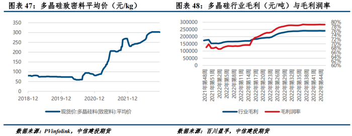 2021年以来,光伏装机需求快速增长,但上游多晶硅产能相对有限,导致硅料环节持续紧张,价格快速攀升。上文提到,多晶硅行业成本是在不断降低的,所以价格上涨所带来的是利润水平不断走高,据百川盈孚数据,截至2022年12月初,多晶硅行业毛利237058.82元/吨,毛利率高达79.02%。