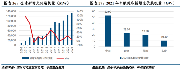 光伏市场是多晶硅最重要的终端消费领域。为了共同应对气候变化、实现绿色可持续发展,建立以可再生能源为主的能源体系成为了各个国家的发展目标。在此背景下,全球光伏市场迎来了快速发展,据国际可再生能源机构数据,2021年全球新增光伏装机量132.81GW,同比增长5.74%,累计光伏装机容量达到了843.09GW。同样以国际可再生能源机构数据口径来看,2021年新增光伏装机量位列前茅的国家或地区分别是中国、欧洲、美国和印度,新增光伏装机量分别为52.99GW、23.04GW、19.90GW、10.30GW。