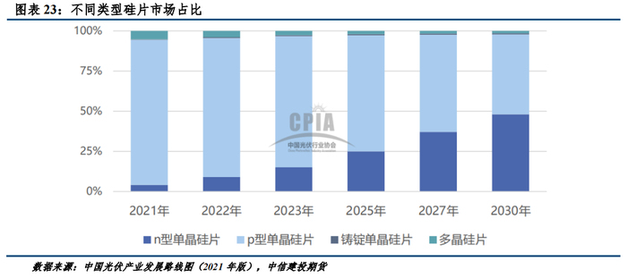 据《中国光伏产业发展路线图(2021年版)》,目前市场上量产的太阳能级单晶硅棒均是由直拉法生产,2021年n型单晶硅片与p型单晶硅片市场占比已经达到了94.5%。