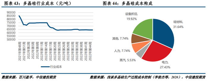 从近一年的数据可以发现,多晶硅行业成本正在不断下降。据百川盈孚数据,截至2022年12月初,多晶硅行业成本为62941.18元/吨,相较年初下降约11.45%。从成本构成看,据《浅谈多晶硅生产过程成本控制》(李俊杰等,2020),多晶硅生产中硅材料成本占比最高,为31.64%,其次是电力成本,占比27.43%。