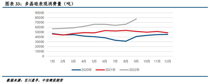 需求方面,受益于光伏产业的高景气度,新增光伏装机量不断走高,带动多晶硅消费快速增长。据百川盈孚数据,2021年多晶硅表观消费量达到59.55万吨,同比增长20.19%;2022年1-9月多晶硅表观消费量为57.58万吨,已经快接近2021年全年水平。