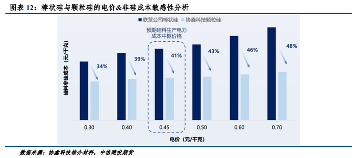 改良西门子法属于高温还原反应,相较于硅烷流化床法,所需的人力成本更高,能耗、固定资产及运营成本也相对较高。而硅烷流化床法属于催化裂解反应、高自动化产业,实际炉内温度只需加温至600~700℃,有效降低硅料端电耗近80%,并且工艺流程简洁高效,数字化工厂也减少了人工依赖。另据公司的推介材料,在电价水平为0.45元/千克的情况下,相较于棒状硅,颗粒硅的非硅成本中枢可以降低约41%。