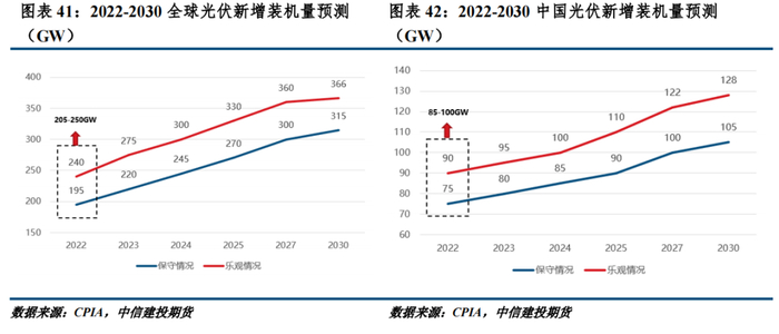 展望未来,在全球达成减碳共识的背景下,国内外光伏刺激政策相继落地,全球光伏装机规模仍将保持较高的新增规模。根据中国光伏行业协会预测,预计2022年全球光伏新增装机量为205-250GW,预计到2030年全球新增光伏装机量将达到315-366GW。此外,由于成本不断降低加上长期购电协议带来的稳定收益,平价项目申报已超预期,未来国内光伏装机规模有望持续增加。预计2022年国内新增光伏装机量将达到85-100GW,2030年国内新增光伏装机量将达到105-128GW。