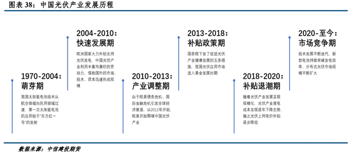 正如上文所述,中国是全球光伏产业第一大国。回顾中国光伏产业的发展,大体可以分为萌芽期、快速发展期、产业调整期、补贴政策期、补贴退潮期、市场竞争期等几个阶段。驱动中国光伏产业持续发展的动力包括海外政治因素倒逼、补贴政策变化和技术变革等,随着2021年光伏产业全面进入平价上网时代,市场竞争不断加剧,绿色能源需求也在日益增长,光伏产业再度开启景气周期。