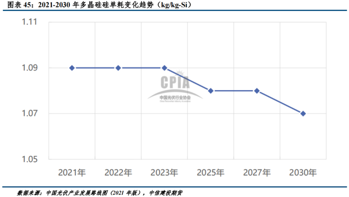 衡量硅材料成本的指标为硅单耗。硅单耗是指生产单位高纯硅产品所耗费的硅量,主要包括合成、氢化工序,外购硅粉、三氯氢硅、四氯化硅等含硅物料全部折成纯硅计算,外售氯硅烷等按含硅比折成纯硅计算,从总量中扣除。据《中国光伏产业发展路线图(2021年版)》数据,2021年硅单耗约为1.09kg/kg-Si,基本与2020年持平,且近5年变化幅度不大,但随着氢化水平的提升,副产物回收利用率的增强,预计到2030年将降低到1.07kg/kg-Si。