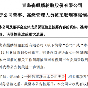 森麒麟在公告中称,经了解,许华山所涉事项与公司无关,相关事项发生在其任职公司董事、财务总监之前。截至公告披露日,公司未收到有权机关对公司的任何调查或配合调查文件。