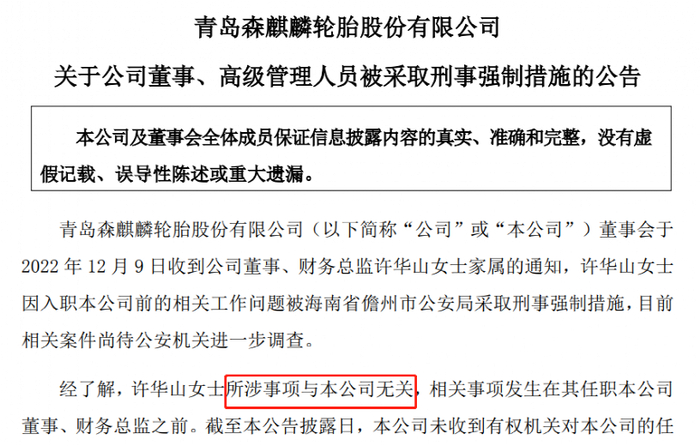 12月9日晚,来自青岛的上市公司森麒麟公告,董事会于2022年12月9日收到公司董事、财务总监许华山家属的通知,许华山因入职公司前的相关工作问题被海南省儋州市公安局采取刑事强制措施,目前相关案件尚待公安机关进一步调查。